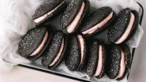 These chocolate sandwich cookies are like giant Oreos. They have that great chocolate flavor from Modern Mountain Black Cocoa Powder and are filled with a generous serving of vanilla buttercream in the center. These are perfect with a glass of cold milk and are sure to satisfy any sweet tooth!