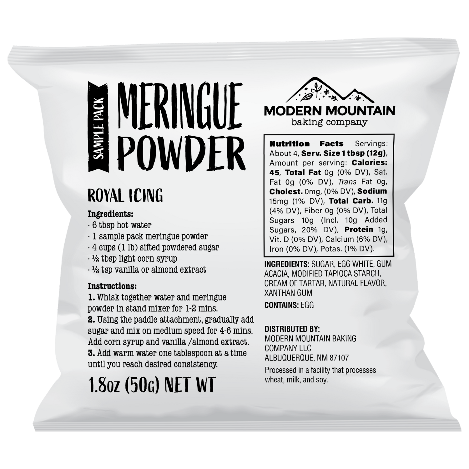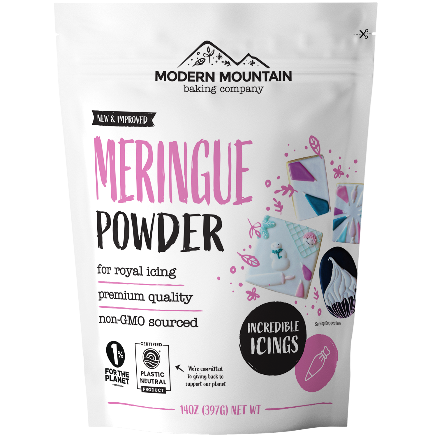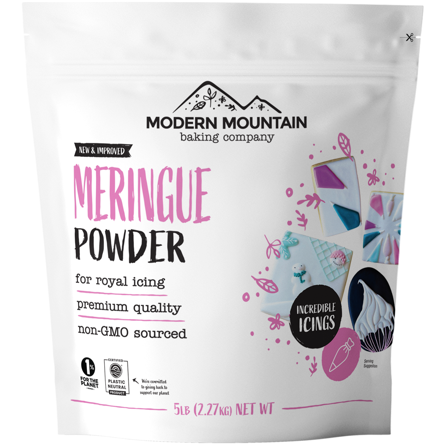 Modern Mountain Meringue Powder is made without titanium dioxide (the white colorant found in some other brands but recently banned in the EU due to safety concerns), uses non-GMO sourced ingredients, and contains only natural flavoring. It creates royal icing with excellent structure, quick dry time, and a clean taste that won't compete with your cookie flavors.